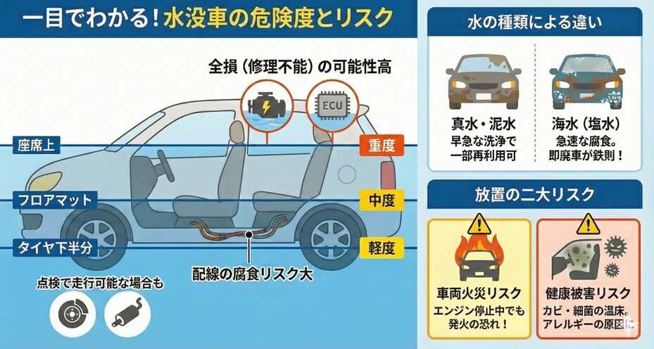 ここでは、なぜ水没車に乗り続けることが危険なのか、その根本的な理由とリスクについて詳しく解説します。