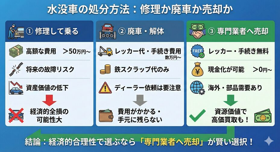 結論として、水没車の最も賢い処分方法は、「水没車・廃車専門の買取業者」への売却です。