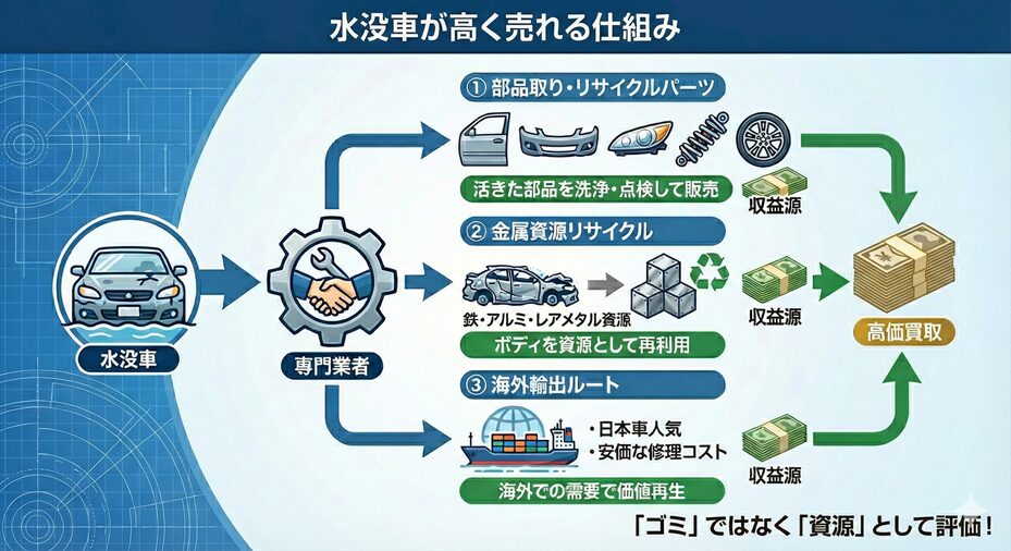 ディーラーはあくまで「車を販売すること」が本業であり、リスクの高い水没車の再利用ノウハウを持っていません。