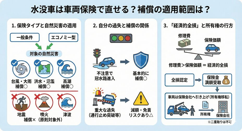 「エコノミーだと自損事故が出ないから、水没もダメなのでは?」と不安になる方も多いですが、ここで良いニュースです。ほとんどの保険会社において、台風・洪水・高潮による水没被害はエコノミー型であっても補償の対象となっています。