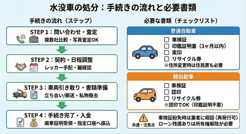 いざ水没車を処分しようと決めても、初めてのことで何から手をつければいいか分からない方も多いでしょう。