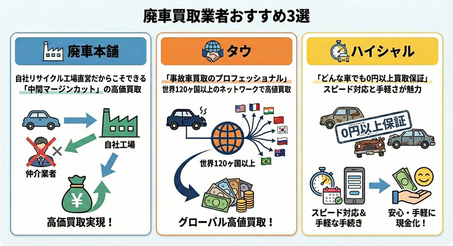 「もう廃車にしよう」と決断した時、次に考えるのが「どこに頼むか」です。