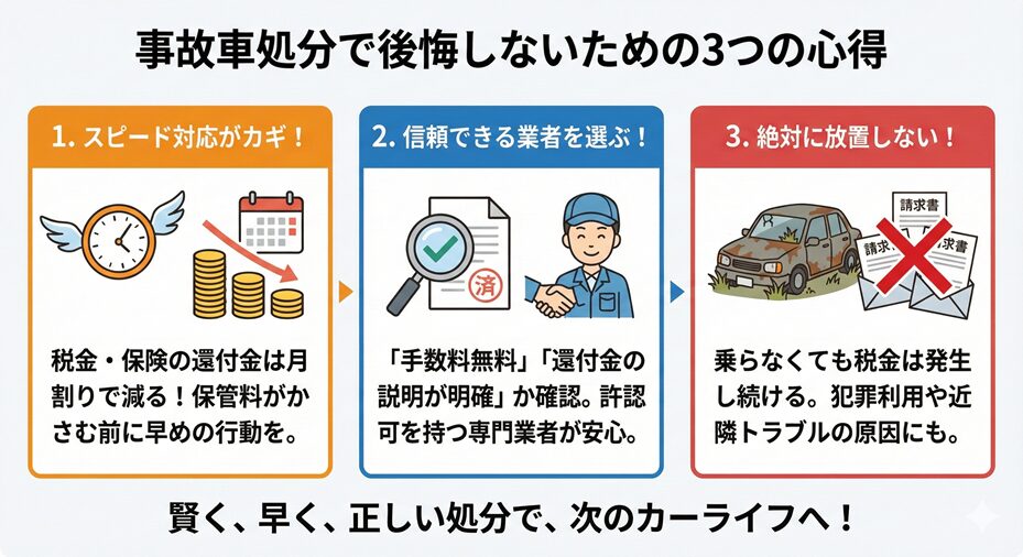 「鉄は熱いうちに打て」ではありませんが、「事故車は早めに動け」が鉄則です。適切なパートナー(業者)を選び、迅速に行動することで、マイナスを最小限に抑え、あるいはプラスに変えることができます。