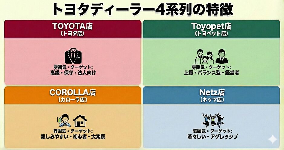 トヨタ車のディーラーは、「トヨタ店、カローラ店、トヨペット店、ネッツ店」の4系列があり、どのディーラーで商談すれば良いのか迷いますよね。